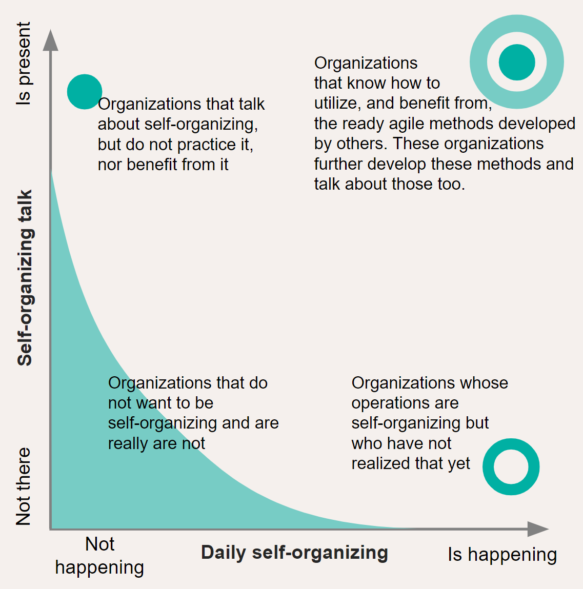 Organizations can be categorized roughly in four based on how self-organizing they want to be, and how much they practice self-organizing patterns and practices.